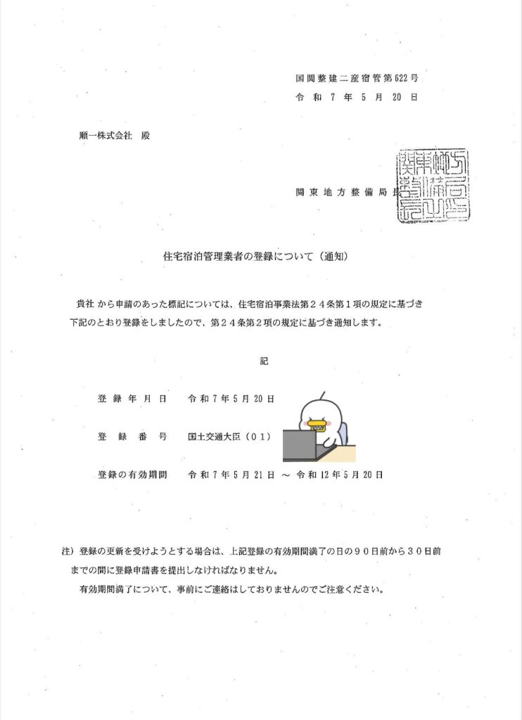 このたび、順一株式会社(本社:東京都)は、住宅宿泊事業法第24条に基づき、住宅宿泊管理業者として正式に登録されました。